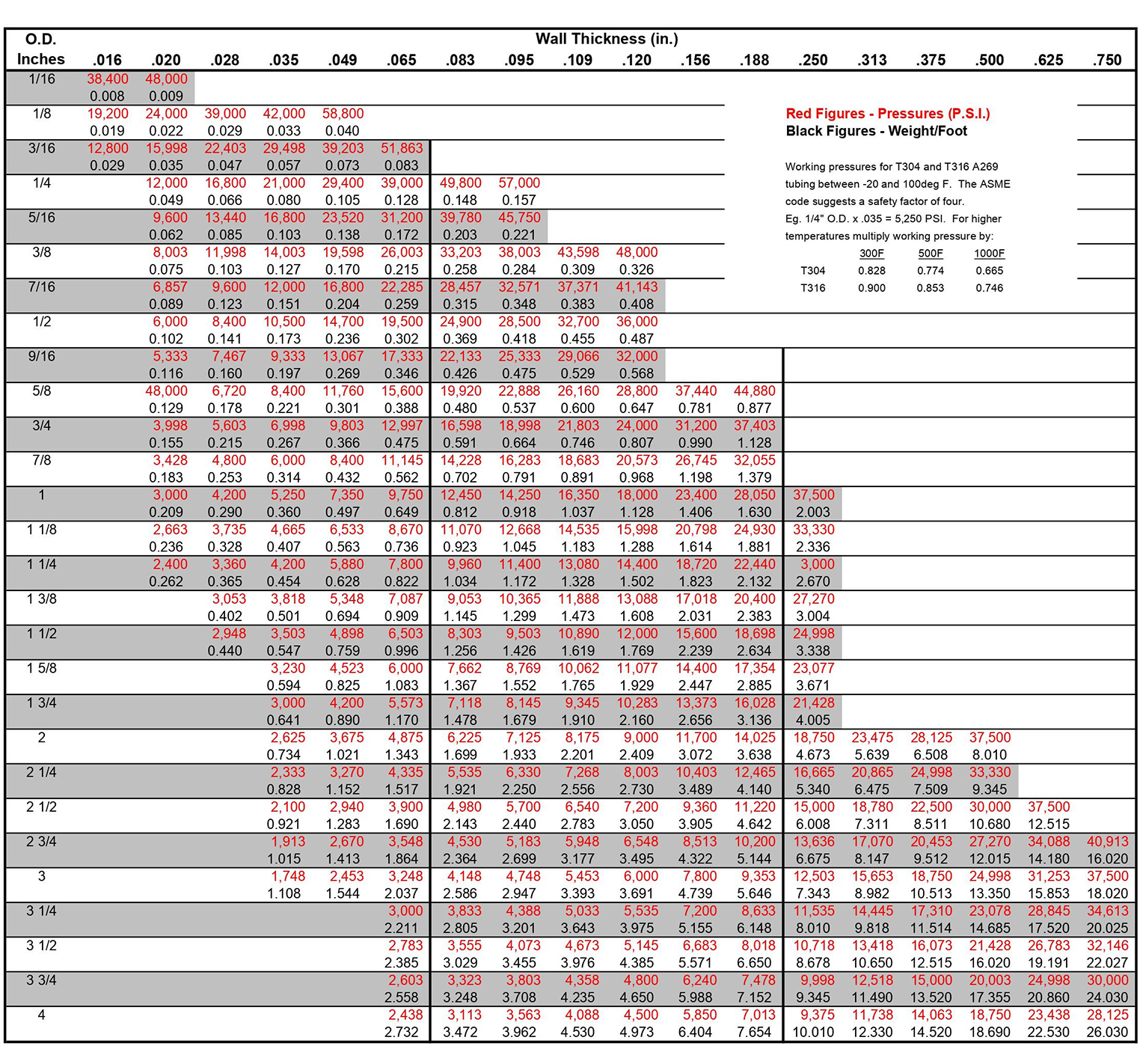 Rozsdamentes cső elméleti törésnyomások és súlyok